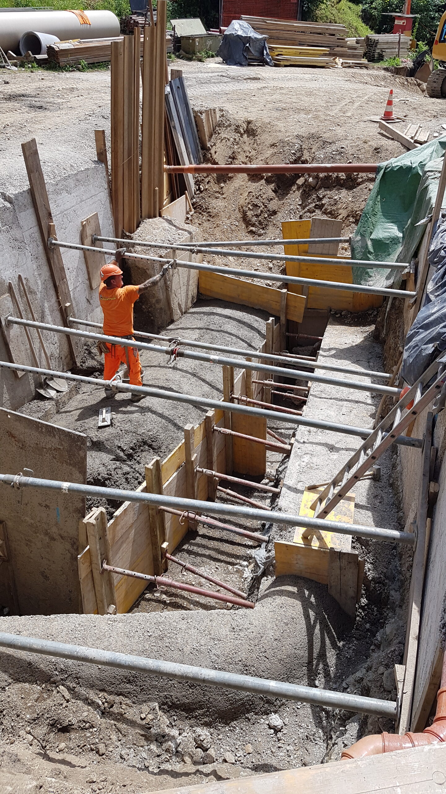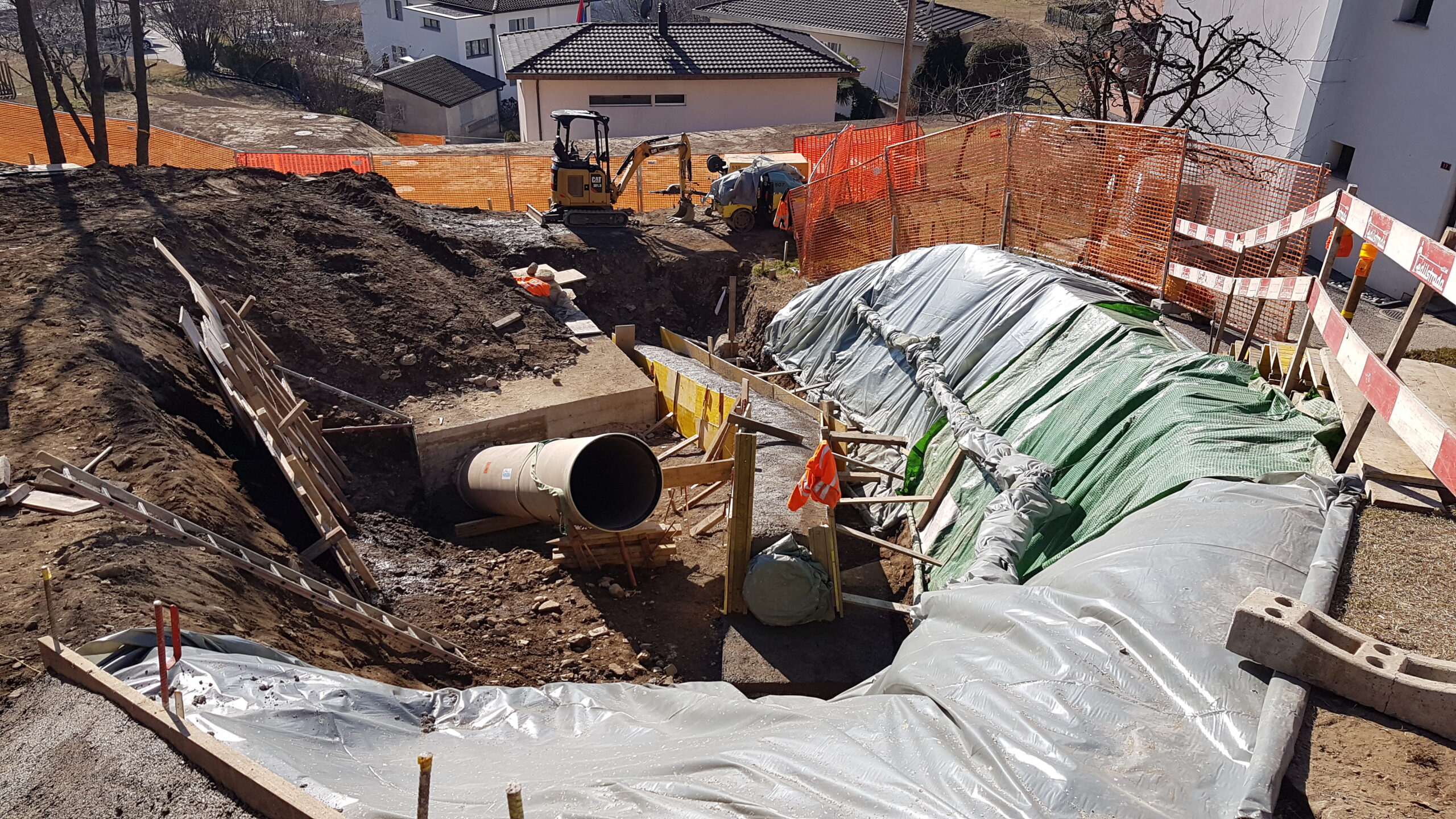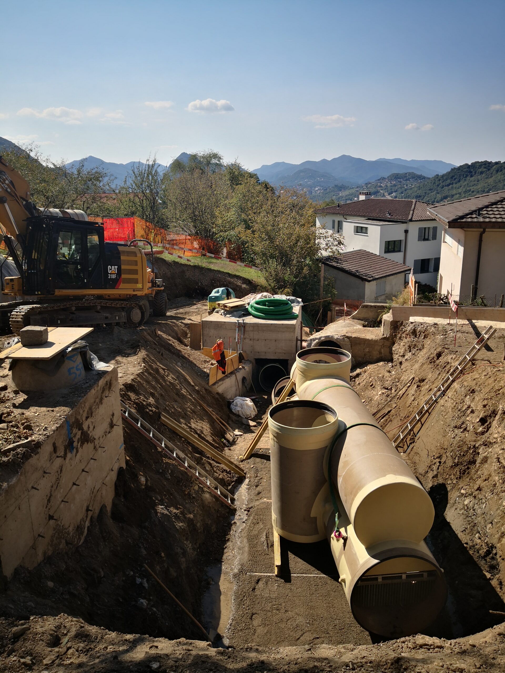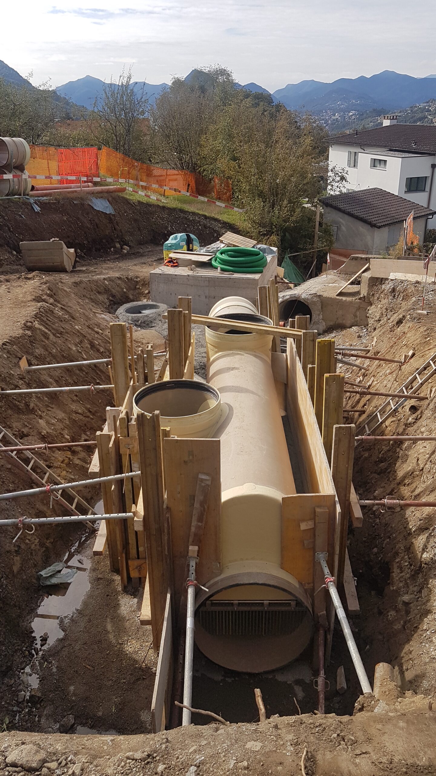 Per il riale intubato sono stati posati tubi PRFV “HOBAS Gravity Pipes SN 10'000” Ø1000/1200, con elevata resistenza all’abrasione e rinfianco in calcestruzzo. Le grandi dimensioni dei manufatti previsti e la pendenza del terreno hanno imposto in taluni casi scavi a profilo “a V”, comportando una gestione complessa del materiale e degli spazi di lavoro.