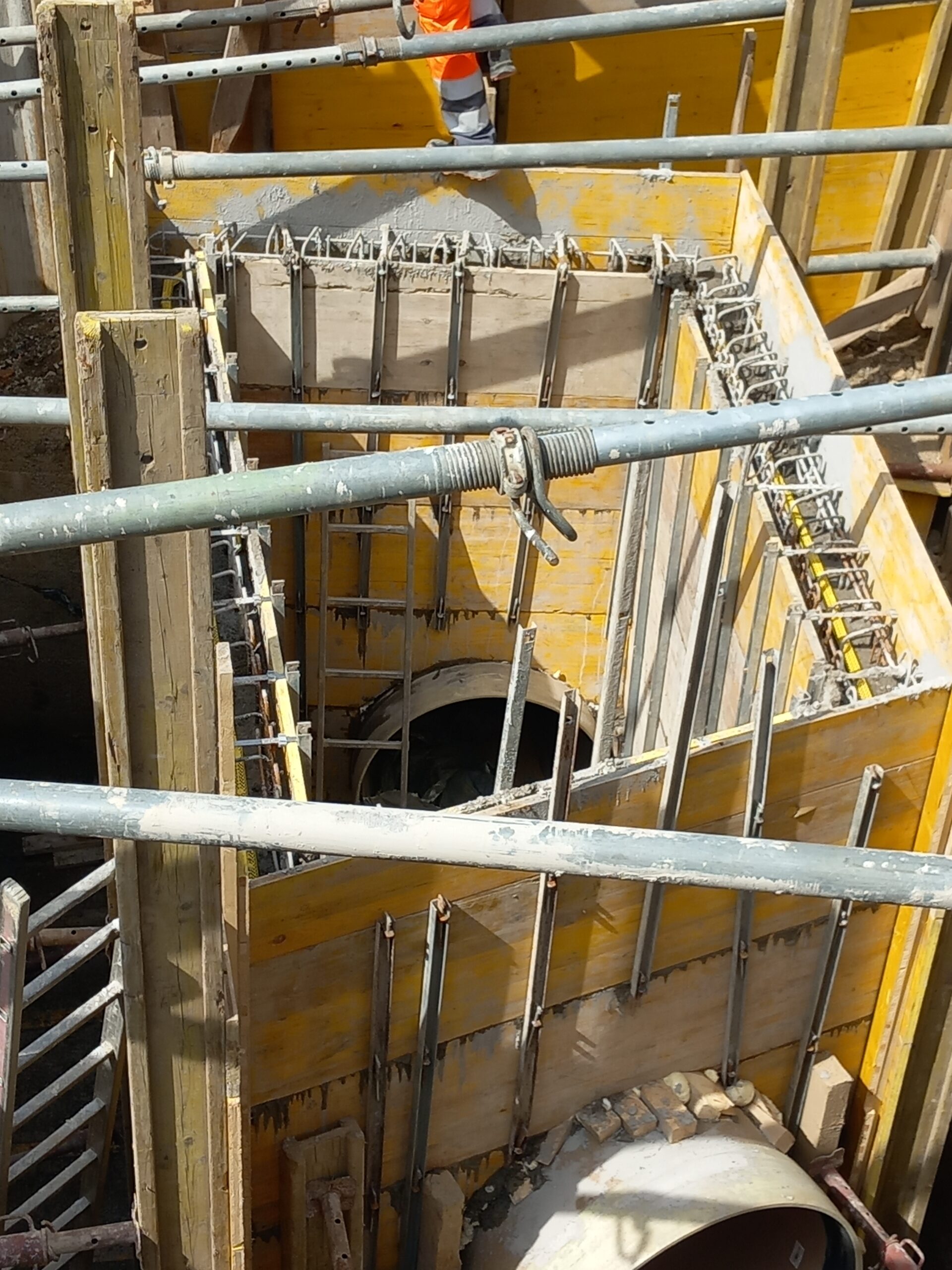 Durante l’esecuzione è emerso uno scostamento del riale rispetto alla posizione prevista, rendendo necessaria una revisione progettuale completa del tracciato per poter posare la nuova condotta garantendo nel frattempo il funzionamento di quella esistente. Le variazioni plano-altimetriche sono state gestite mediante pozzetti prefabbricati in PVC per le acque miste e camere in calcestruzzo armato, spesso adattate in cantiere, per il riale. Lungo il tracciato è stato inoltre installato uno scaricatore di piena prefabbricato “CSO Chamber” Ø1200 della HOBAS, dotato di pettini autopulenti che riducono i materiali sospesi senza necessità di alimentazione.